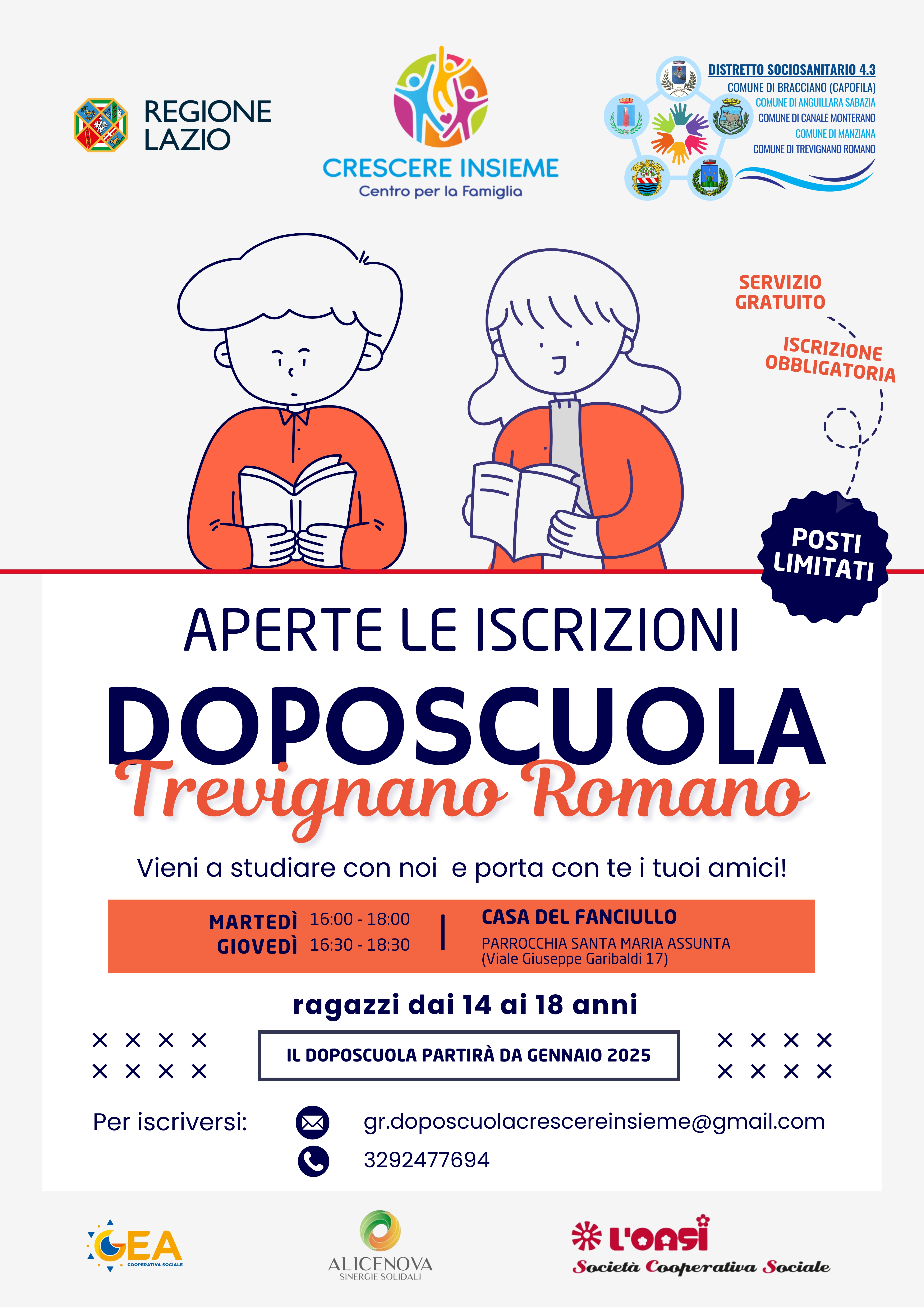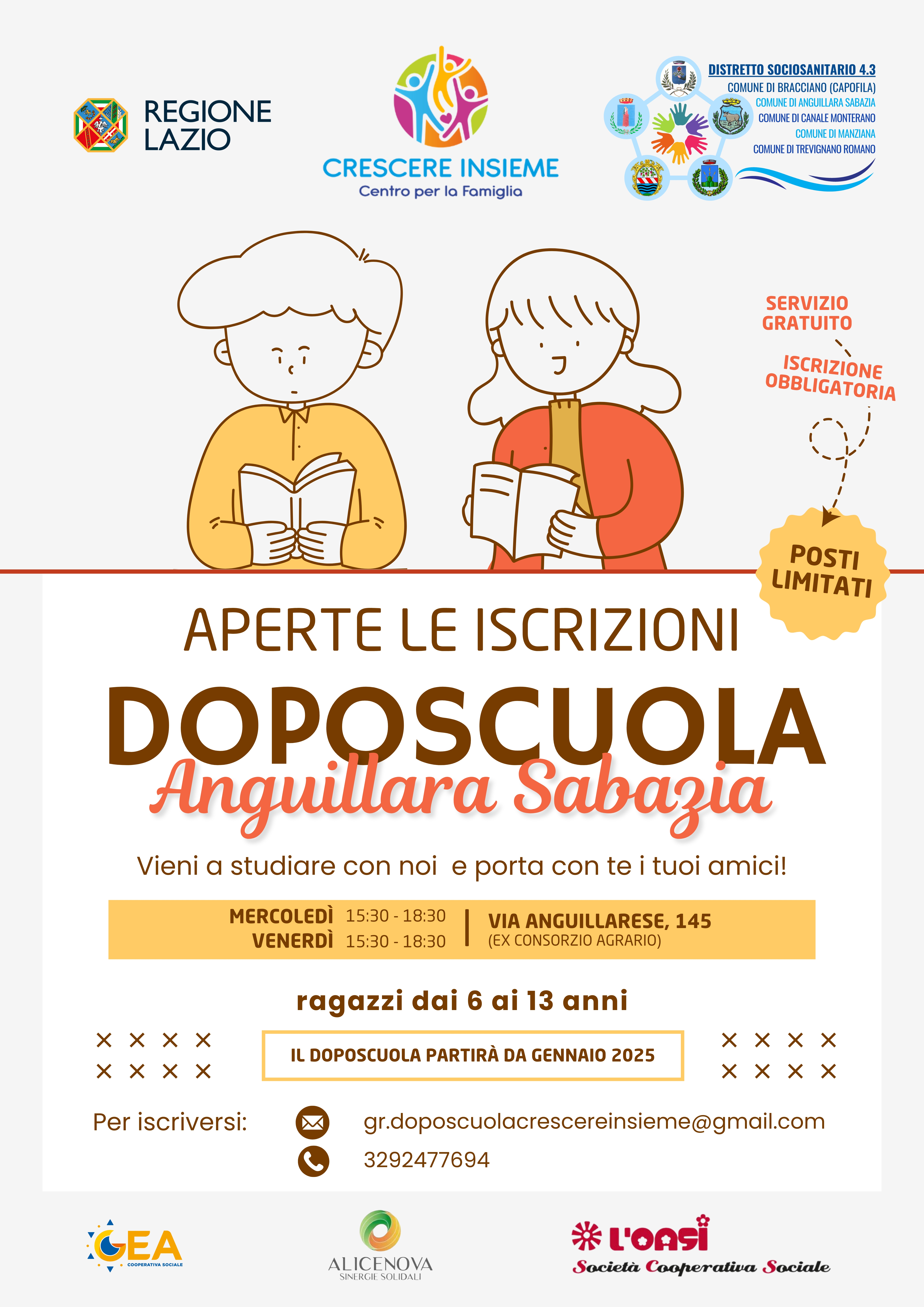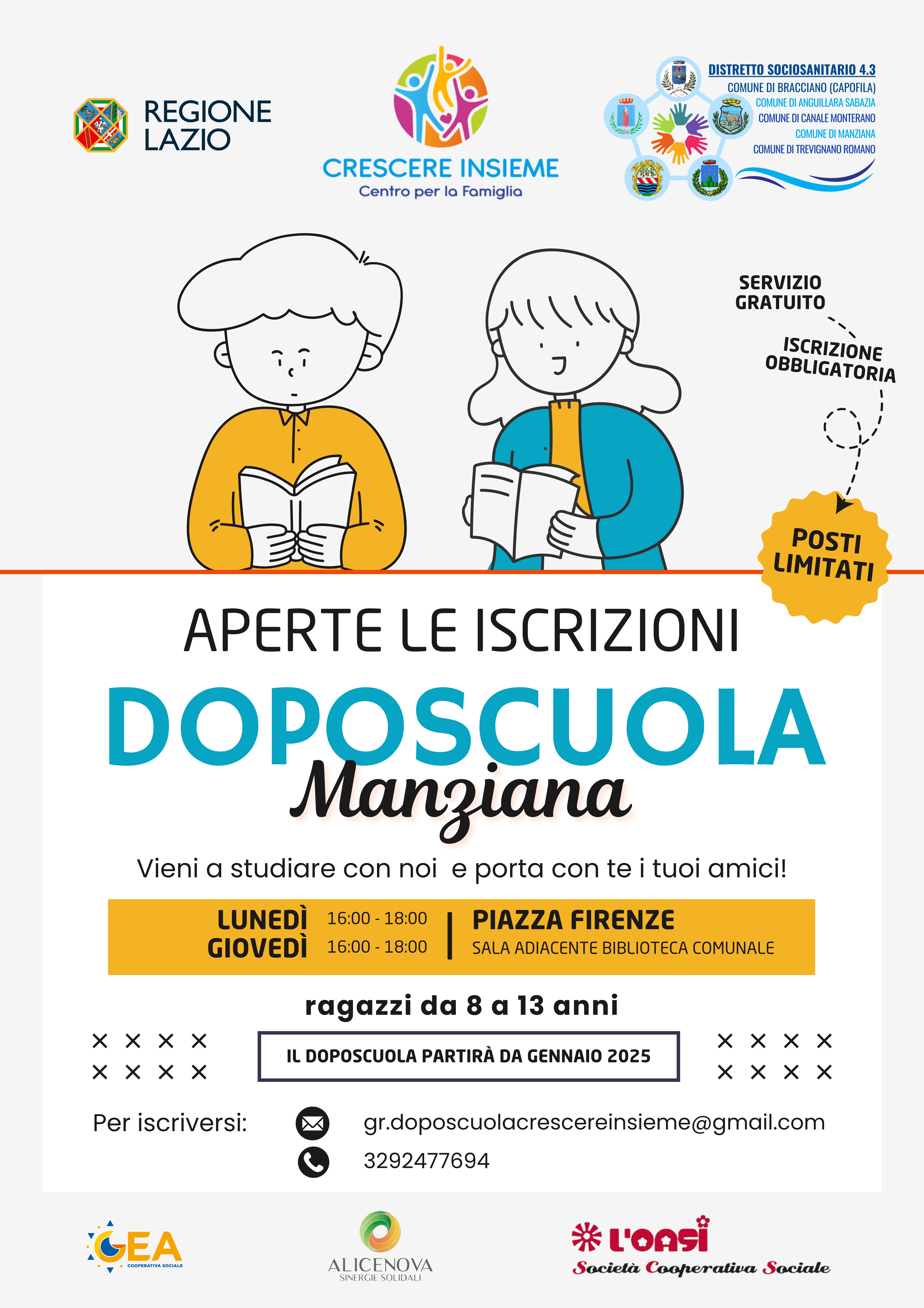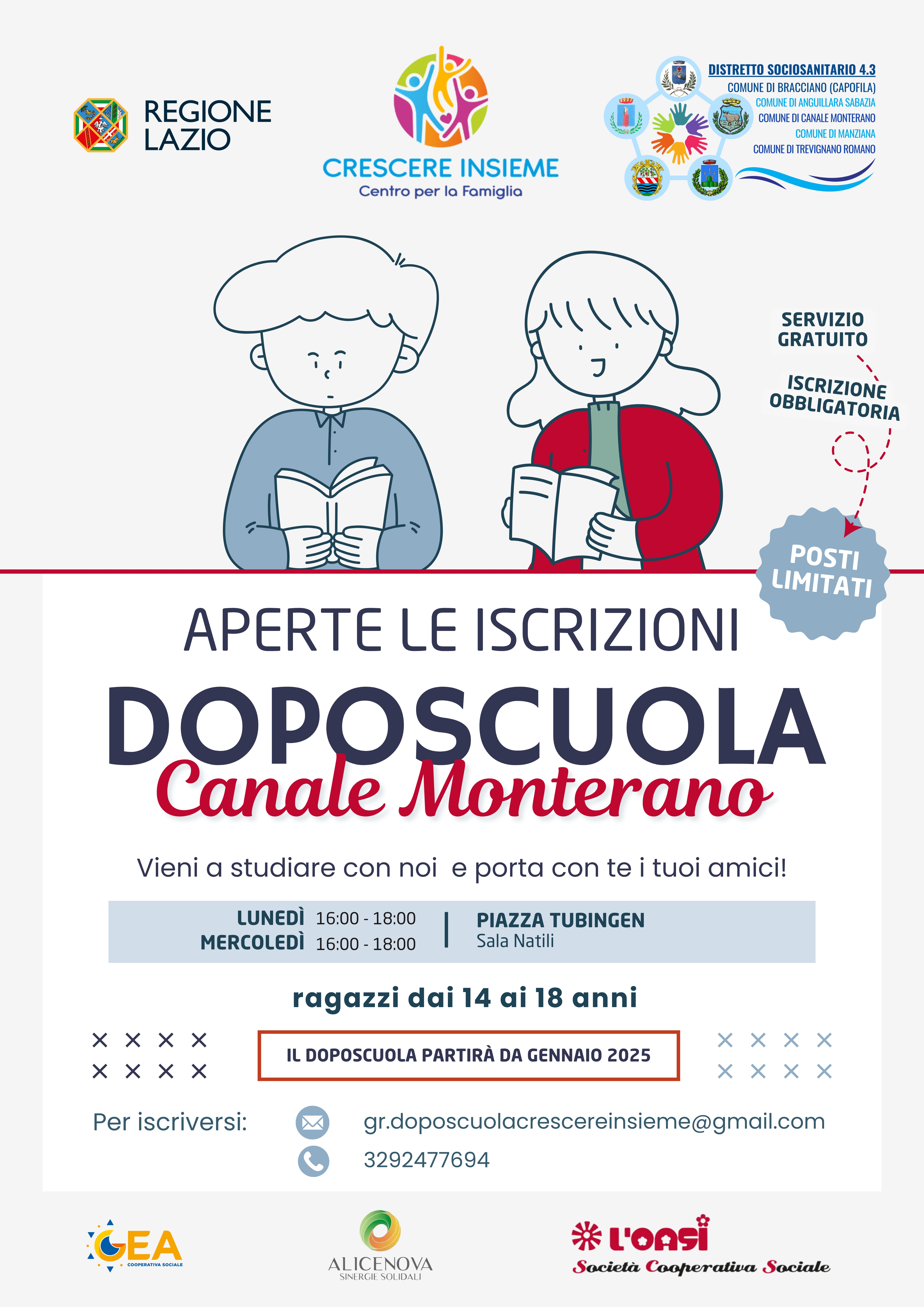 Tutti i gruppi di doposcuola sono gratuiti e aperti agli studenti e alle studentesse dei comuni di Bracciano, Anguillara Sabazia, Canale Monterano, Trevignano Romano e Manziana.